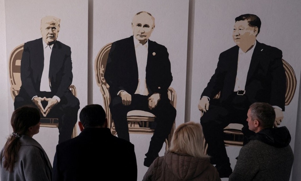 その展示作品は、中央にプーチン、左側にトランプ、右側に習近平が並んで座っている絵画で、かつてのヤルタ会談を彷彿させる構図になっている。
